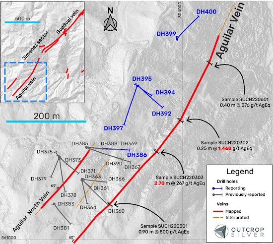 October 16, 2024 – Outcrop Silver & Gold Corporation (TSXV:OCG, OTCQX:OCGSF, DE:MRG) (“Outcrop Silver”) is pleased to provide an update on exploration drilling at the Aguilar vein in its 100% owned Santa Ana high-grade primary silver project. The initial drilling campaign at the Aguilar vein system has been completed, totaling 4,606 metres of drilling and resulting in the discovery of additional non-outcropping veins in this promising target. Outcrop Silver continues drilling with two rigs, one at the Jimenez vein and the second one at the La Ye vein.