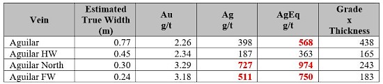 - The Aguilar vein showed a weighted average grade of 568 g/t AgEq (2.26 g/t Au and 398 g/t Ag) (Table 2).