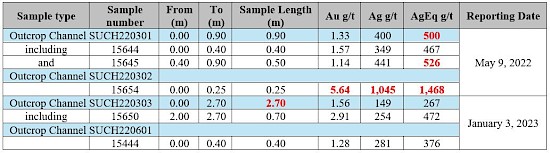 Table 3. Channel sample results at the Aguilar vein from the Target Generation program previously reported (see News Releases dated May 9, 2022 & January 03, 2023).