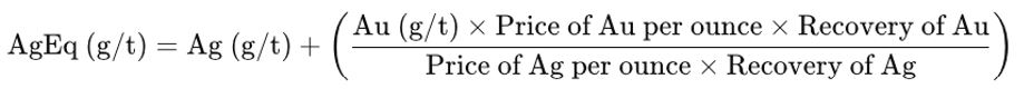 Metal prices used for equivalent calculations were US$1,800/oz for gold, and US$25/oz for silver. The equivalency formula as follows: