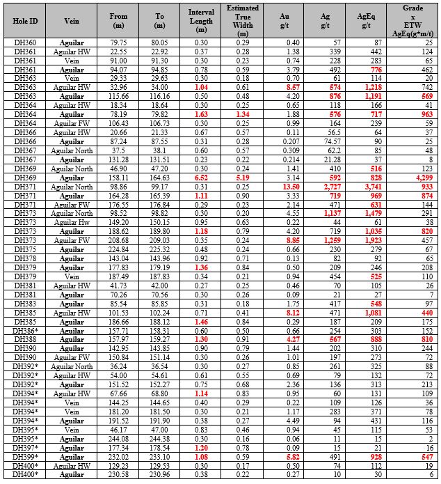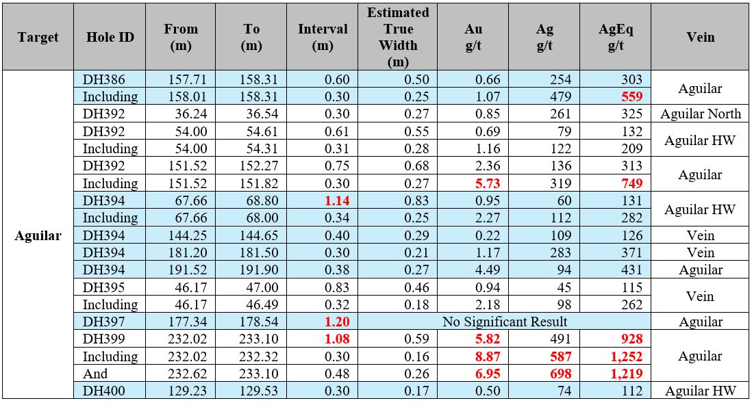 At Aguilar the highest grade intercept was hole DH399 at 928 g/t AgEq (5.82 g/t Au and 491 g/t Ag), and the widest intercept was in hole DH369 with 6.52 metres (5.19 metres estimated true width) at 828 g/t AgEq (3.14 g/t Au and 592 g/t Ag) and a grade times thickness of 4,299 g/t Ag (Table 4).