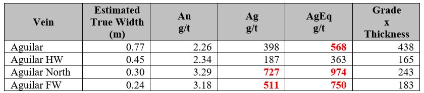 - The Aguilar vein showed a weighted average grade of 568 g/t AgEq (2.26 g/t Au and 398 g/t Ag) (Table 2).