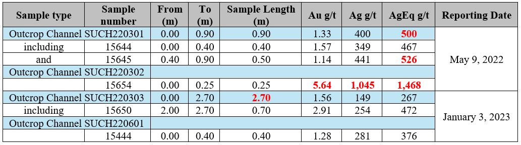 Table 3. Channel sample results at the Aguilar vein from the Target Generation program previously reported (see News Releases dated May 9, 2022 & January 03, 2023).