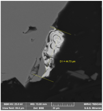 Mineral characterization during testing has shown electrum (Figure 2) to contain 60 to 70% silver (with gold) and represents, on average, 3% of the silver-forming mineral mass. Argentite is the most common silver-phase mineral, with 88% of the total mass, followed by Freibergite, with 8% of the mass on average. Mineralogy is simple, with silver partitioned into mainly three minerals.