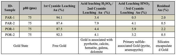 Diagnostic tests for gold show that 90% of the contained gold is in free native form, with only minor amounts from 0.5% to 2% encapsulated in silicates. Native gold has a very high recovery rate from simple processing.
