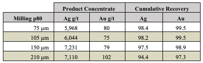On average, 94% of contained silver and 96% of contained gold were recovered in a concentrate containing 6,540 grams per tonne of silver and 82.94 grams per tonne of gold.