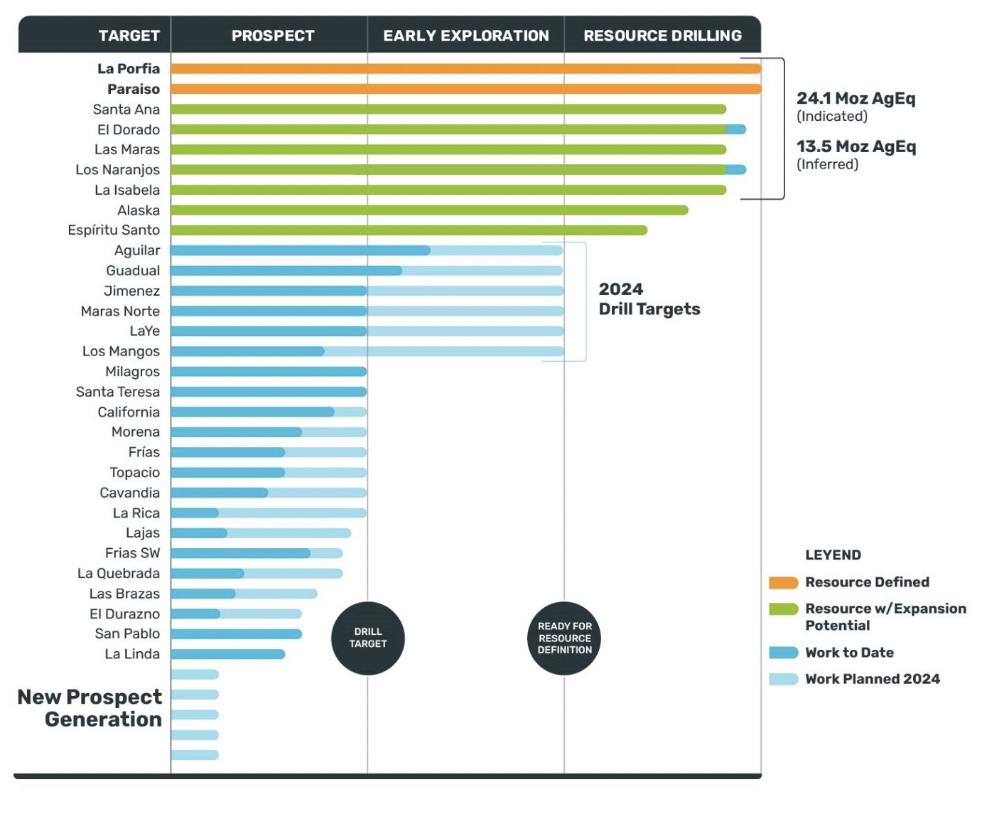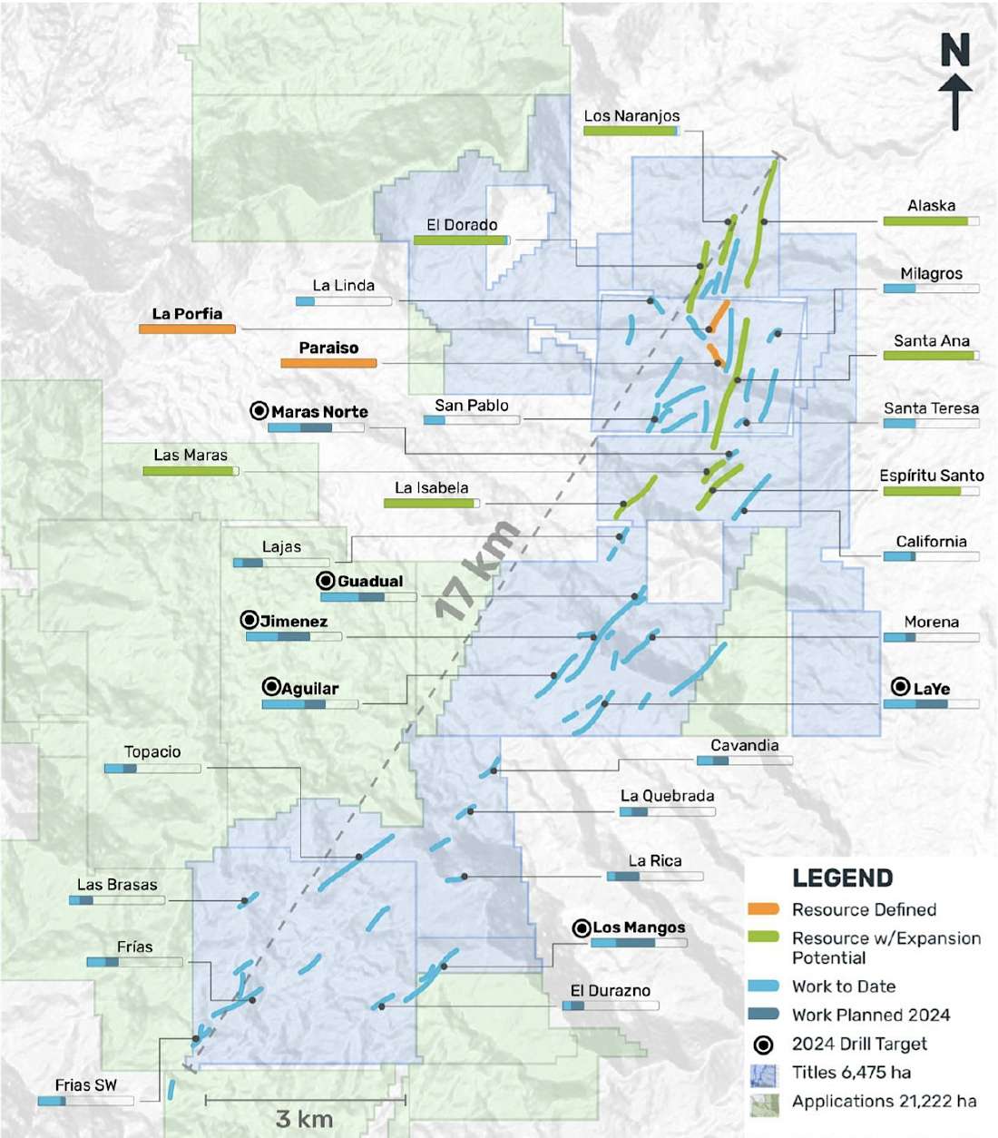 Figure 1. 2024 Exploration Program with Regional Exploration Program. Mineral resources as defined by the 43-101 report prepared by Rodney Webter (MAIG), Robert Chester (FAusIMM) and Jose Olmedo (SME). See news release from April 26, 2023 and June 12, 2023