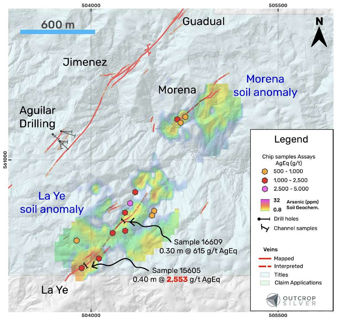 - The Morena vein was discovered through soil geochemical surveys as part of the exploration effort near La Ye vein (Figure 4). Located 1 kilometre northeast of La Ye vein, chip and channel samples have returned up to 1,237 grams per tonne of silver equivalent (Table 1).