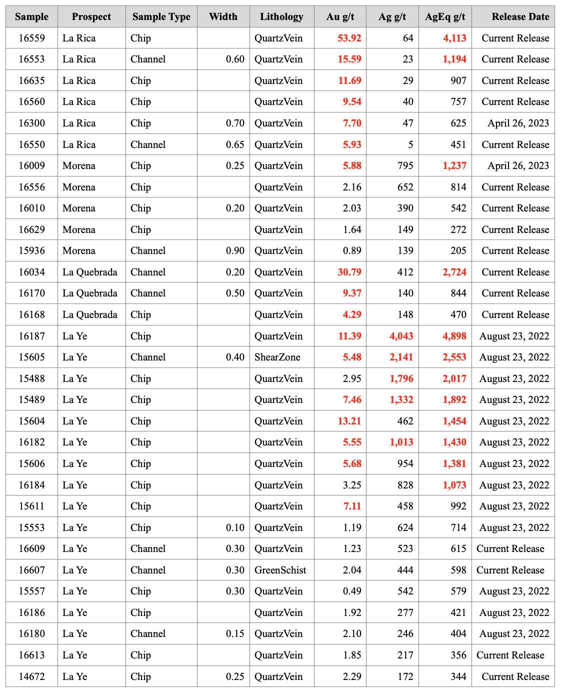 - La Rica is a vein system discovered during recognizance campaigns along the Frias and Santa Ana trend, returning 4,113 and 1,194 grams per tonne of silver equivalent in chip and channel samples (Table 1).