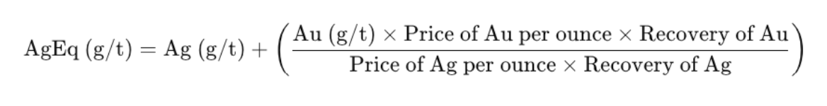Metal prices used for equivalent calculations were US$1,800/oz for gold, and US$25/oz for silver. The equivalency formula as follows: