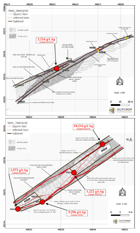 The Royal Santa Ana Mines are 12 kilometres northeast of the Frias Mine and Los Naranjos is 18 kilometres northeast of of the Frias Mine along trend. The entire area is 100% owned by Outcrop Silver. The Frias mine is hosted by the same southwest vein trend from Aguilar-Guaduales, 8.5 kilometres to the northeast. The Frias mine is within a parallel vein package (Map 1). These veins are spaced approximately 200 metres apart, similar to the grouping of parallel veins hosting the Royal Santa Ana mines. At least three parallel veins are observed in the underground workings, with two showing stoping activities defining the high-grade shoot (Map 2 and Map 3). Silver mineralization and trace gold mineralization are strongly associated with galena and sphalerite in quartz veins and shear zones (Table 1).