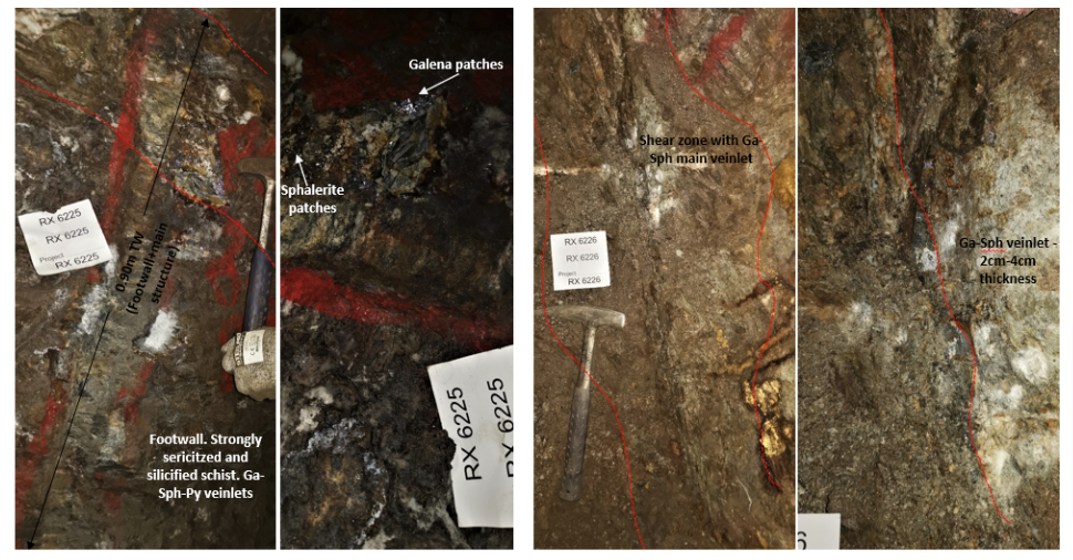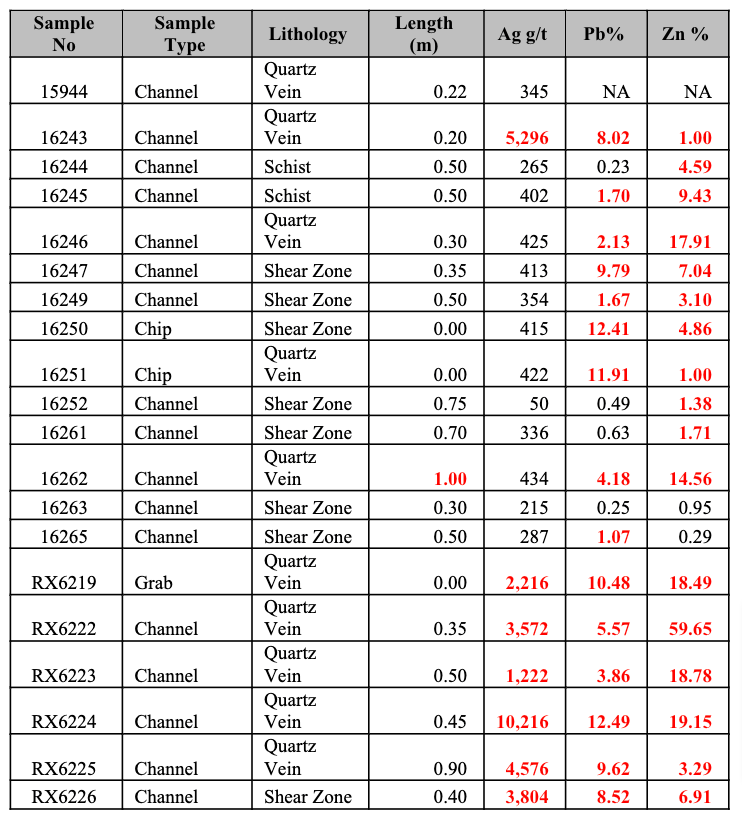 Channel sample RX6225 returned 4,576 grams per tonne of silver, 9.62% lead, and 3.29% zinc from a 0.90 metre wide vein and veinlet zone on vein margins.