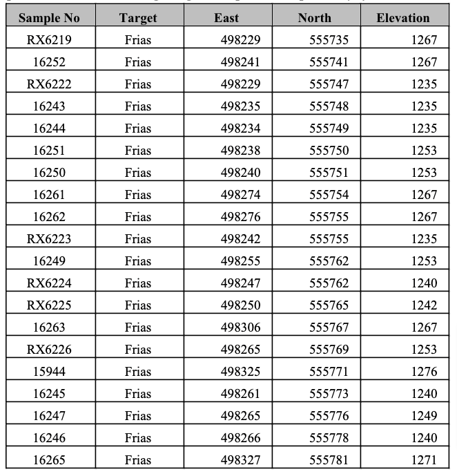 Table 1. Significant rock samples from the historic Frias Mine underground workings. Gold only occurs in trace amounts and assays are not included in the table.