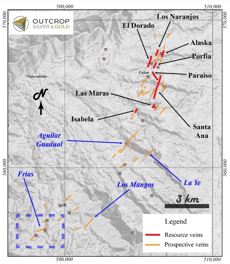 Outcrop drilling indicates that mineralization extends from surface or near surface to depths of at least 370 metres. Cumulatively, over 60 kilometres of mapped and inferred vein zones occur on the Santa Ana project. The Frias Mine on the south-central part of the project, 16 kilometres south of the Royal Santa Ana Mines, produced 7.8 million ounces of silver post-production in the Spanish colonial era at a recovered grade of 1.3 kg Ag/t. The Frias Mine is considered an analogue to each of the thirteen shoots discovered to date by Outcrop. Between the Royal Santa Ana Mines and the Frias Mine, veins have been extended to the south providing strong drill targets in the Aguilar, Espiritu Santo and El Cristo veins that show high values up to 5.5 kg AgEq/t. These veins show widths up to 4.7 metres. Twelve kilometres of vein zones have been mapped between El Dorado vein to the north and the Aguilar vein to the south. An additional seven kilometres of veins have been mapped between Aguiler and the Frias mine, including the veins Los Mangos and La Ye, which provide several targets with high values up to 9,738 g AgEq/t.