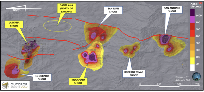 At the core Royal Santa Ana project, located at the northern extent of just one of the regional vein systems controlled by Outcrop, seven high grade shoots have been discovered – La Ivana hanging-wall and footwall (La Porfia vein system); San Antonio, Roberto Tovar, San Juan (Royal Santa Ana vein systems); El Dorado (El Dorado and El Paraiso vein systems) and Megapozo (El Paraiso vein system). Each zone commonly contains multiple parallel veins. The veins can show both high-grade silver and high-grade gold mineralization and low angle veins appear to connect more common high angle veins.