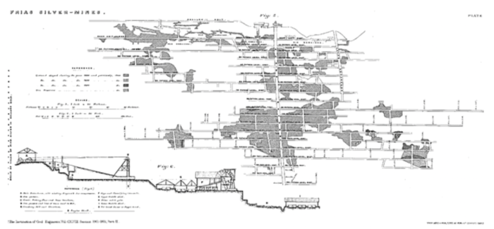 Shoot and level maps for Frias show a mined dimension of approximately 240 metres along the surface and 310 metres down dip, and an apparent rake observable from the distribution of stopes that provides a long axis of 460 metres. The vein widths are reported to range from less than 0.25 metres up to 6 metres.
