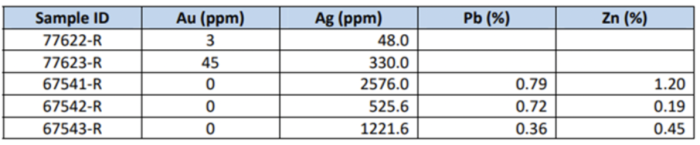 - Recently discovered vein outcrop and float that assay up to 4.7 g Au/t and 5,242 g Ag/t.