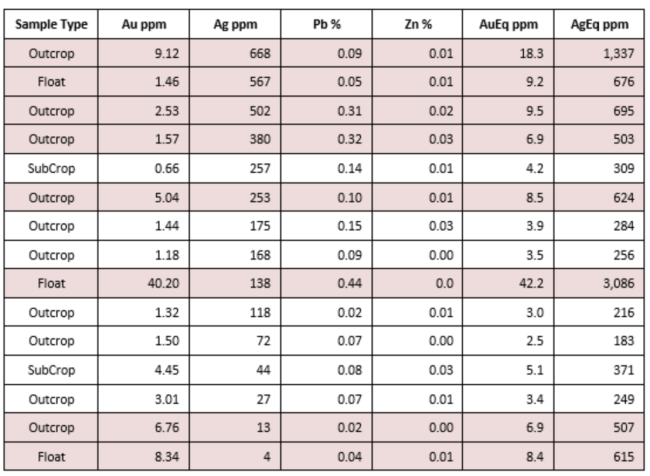 • New Maras target west of the Espiritu Santo target (both 1,100 metres south of the San Antonio discovery) shows high values to 2,087 grams silver equivalent per tonne within an area of vein float and sub-crop over 200 metres long.