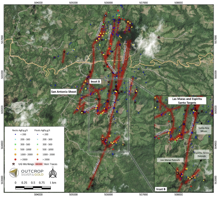 At the core Santa Ana project, located at the northern extent of just one of the regional vein systems controlled by Outcrop, at least twelve principle vein zones are recognized that cumulatively provide up to 17 kilometres of cumulative strike length – La Ivana (La Porfia vein system), Roberto Tovar (Royal Mines, including the Santa Ana, Delhuyar and Roberto Tovar vein systems), San Juan (Santa Ana and Delhuyar vein systems), El Dorado (El Dorado and El Paraiso vein systems), Morales, Pollera, Guanabanera, San Antonio (Santa Ana vein system), Palomos, Murillo, Culebra and Megapozo (El Paraiso vein system). Each zone commonly contains multiple parallel veins. The veins can show both high-grade silver and high-grade gold mineralization and may be both low and high angle depending on local controls. Drilling indicates that mineralization extends from surface or near surface to depths of at least 350 metres locally.