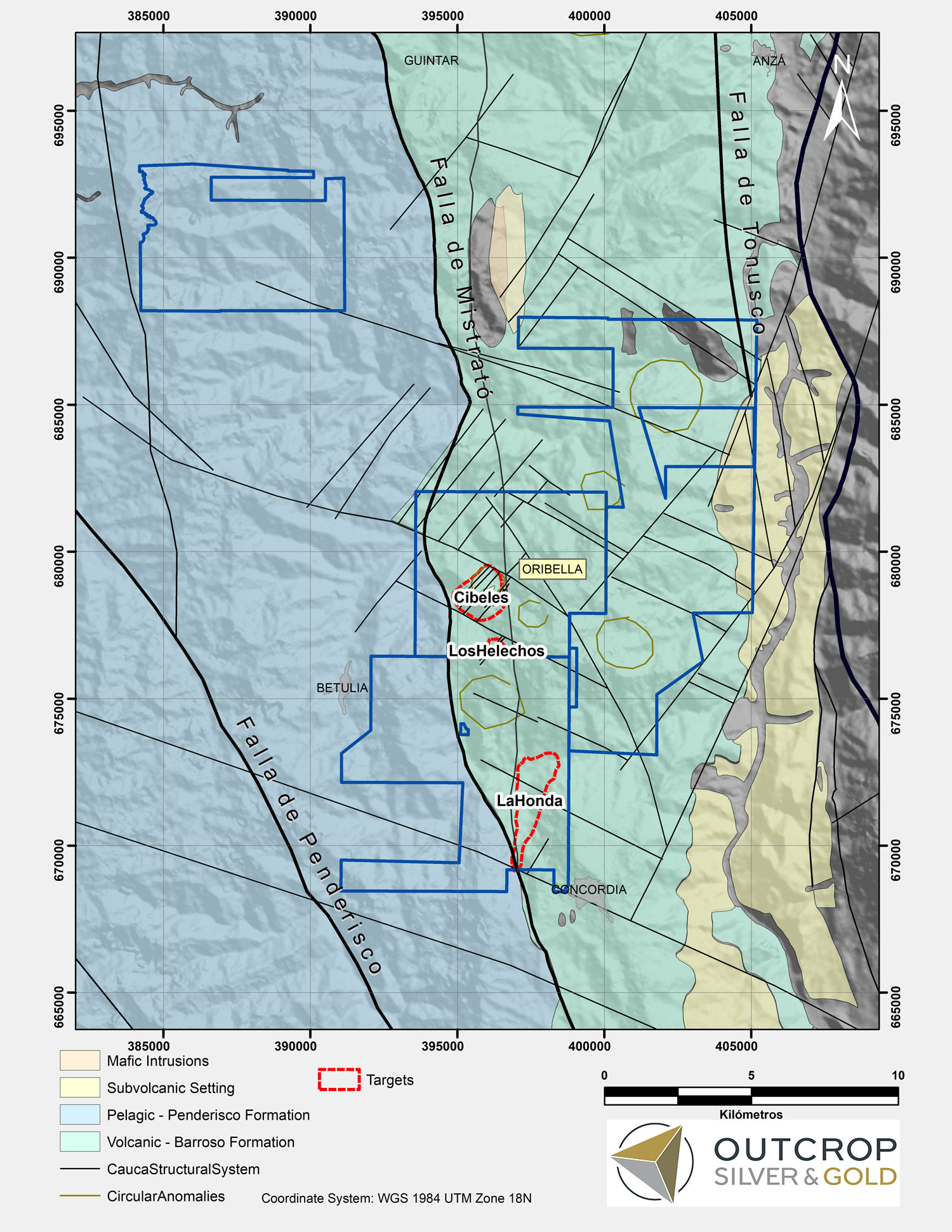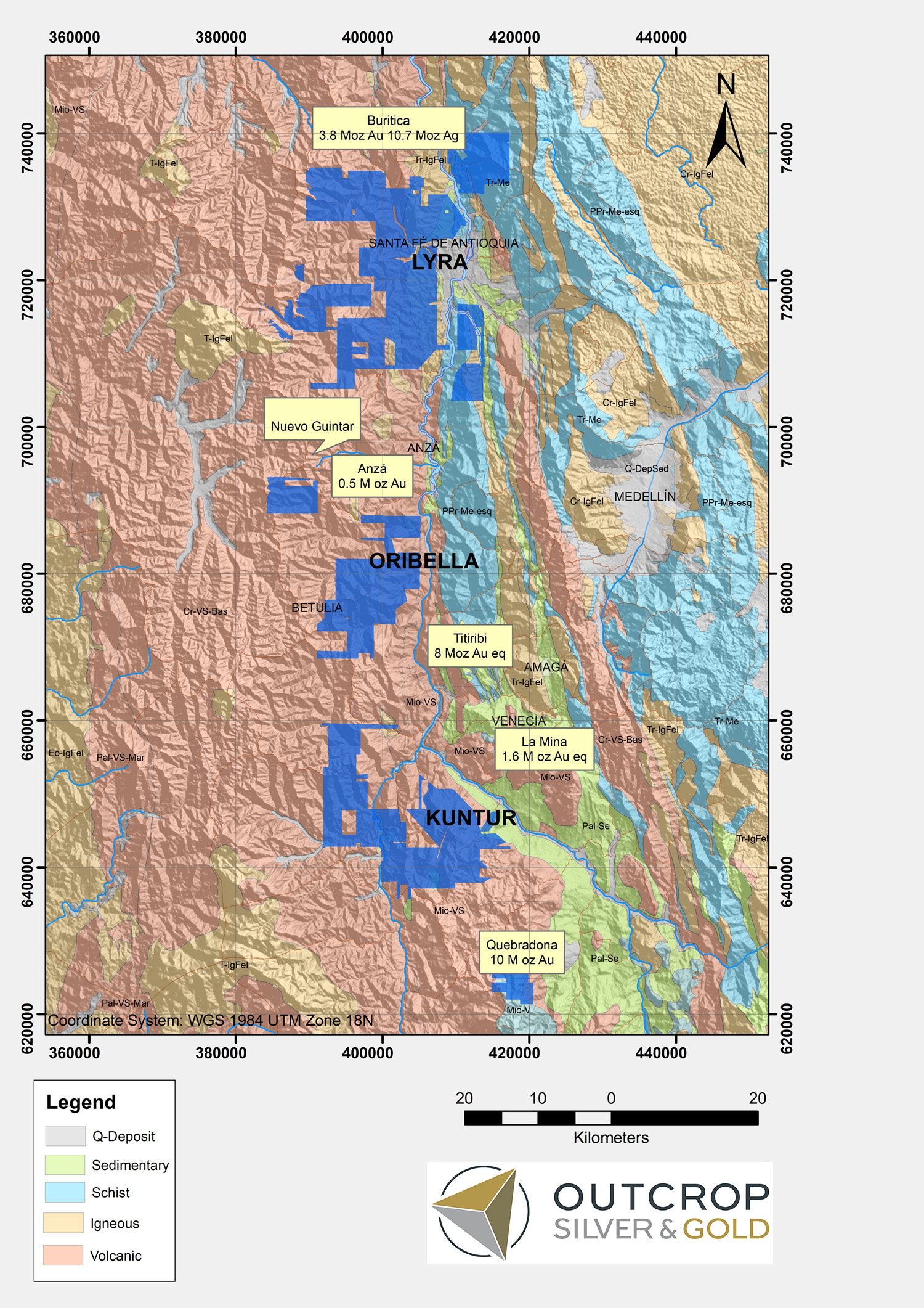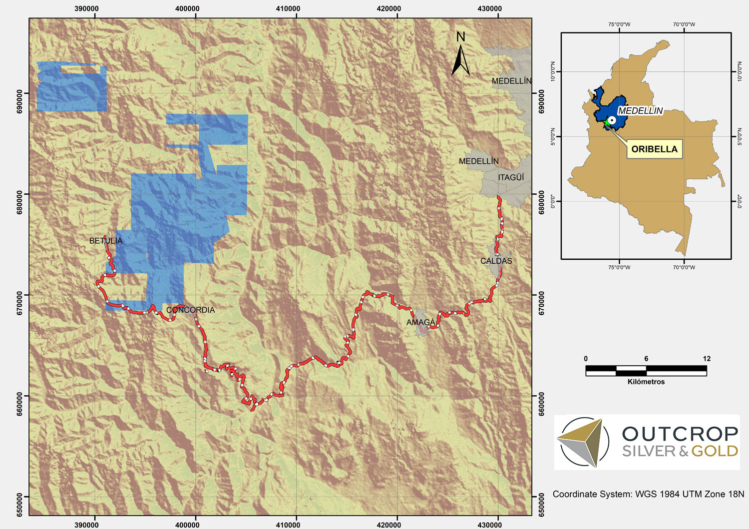 The Oribella project comprises 20,000 ha and is located in Antioquia Department within the Middle Cauca Belt metallogenic province, which has a remarkably high distribution of large Au-Cu Porphyries, commonly showing related epithermal elements, and also epithermal replacement and vein systems without direct relationship to intrusives. It is within a metal rich part of the Middle Cauca Belt metallogenic province that extends for 120 km and hosts Buritica and Nuevo Chaquiro (Quebradona).