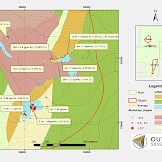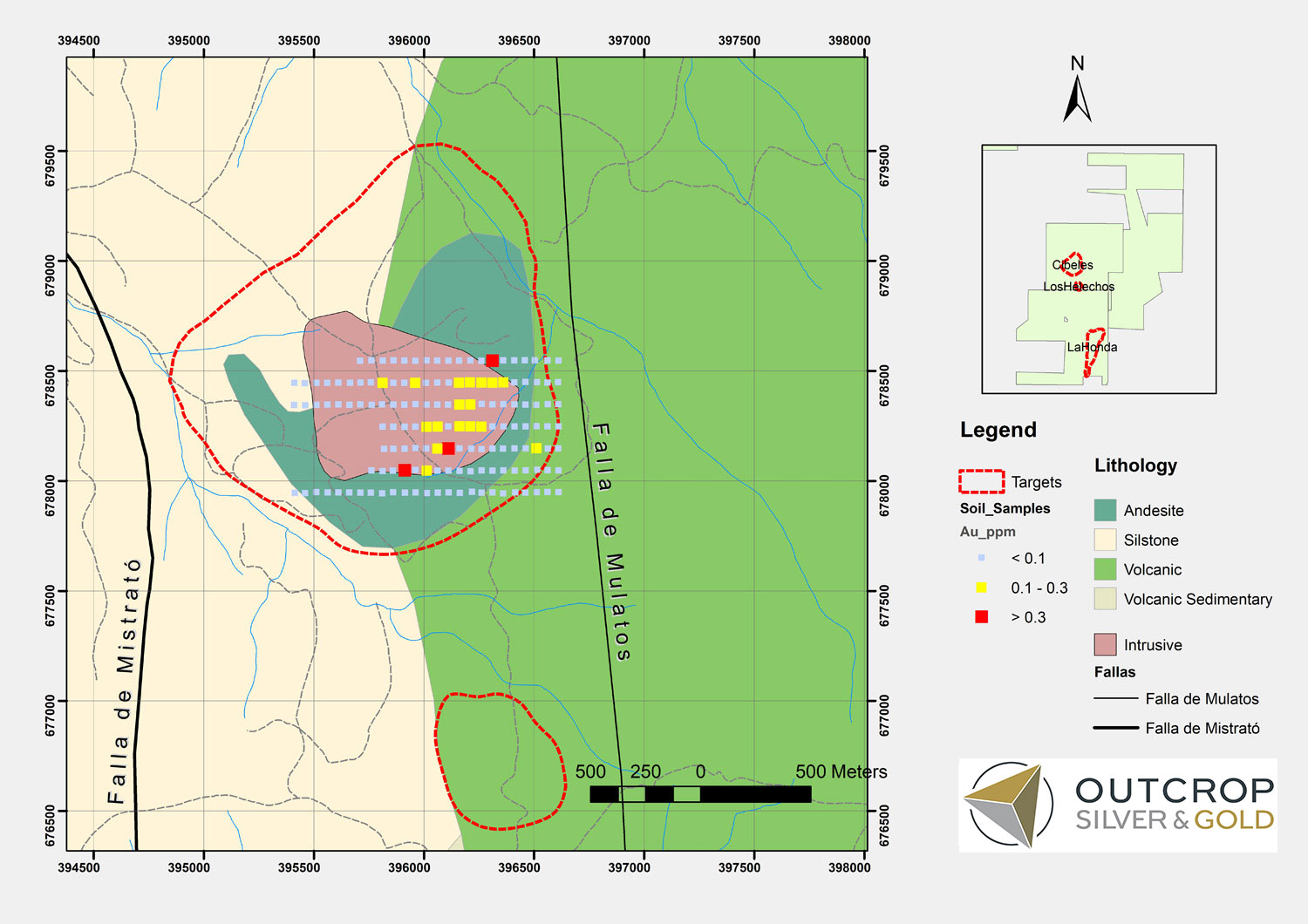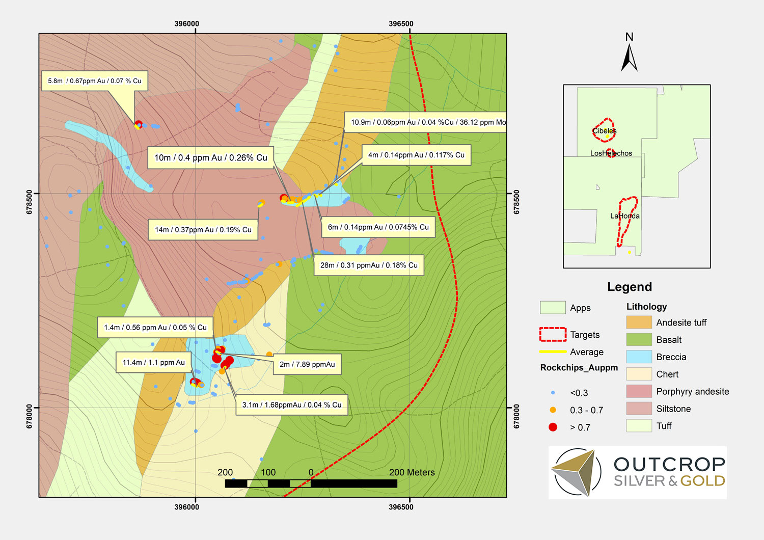 Exploration completed by Outcrop includes mapping, channel sampling, hand trenching, and soil sampling. Outcrop soil sampling shows robust gold and copper anomalies that are spatially offset to each other and also an inferred epithermal zonation pattern in trace elements in relation to gold. The gold anomaly is approximately 500 m by 250 m and open in two directions. Limited hand trenching within the soil anomaly shows 11 m @ 1.1 g Au/t in the subsurface.